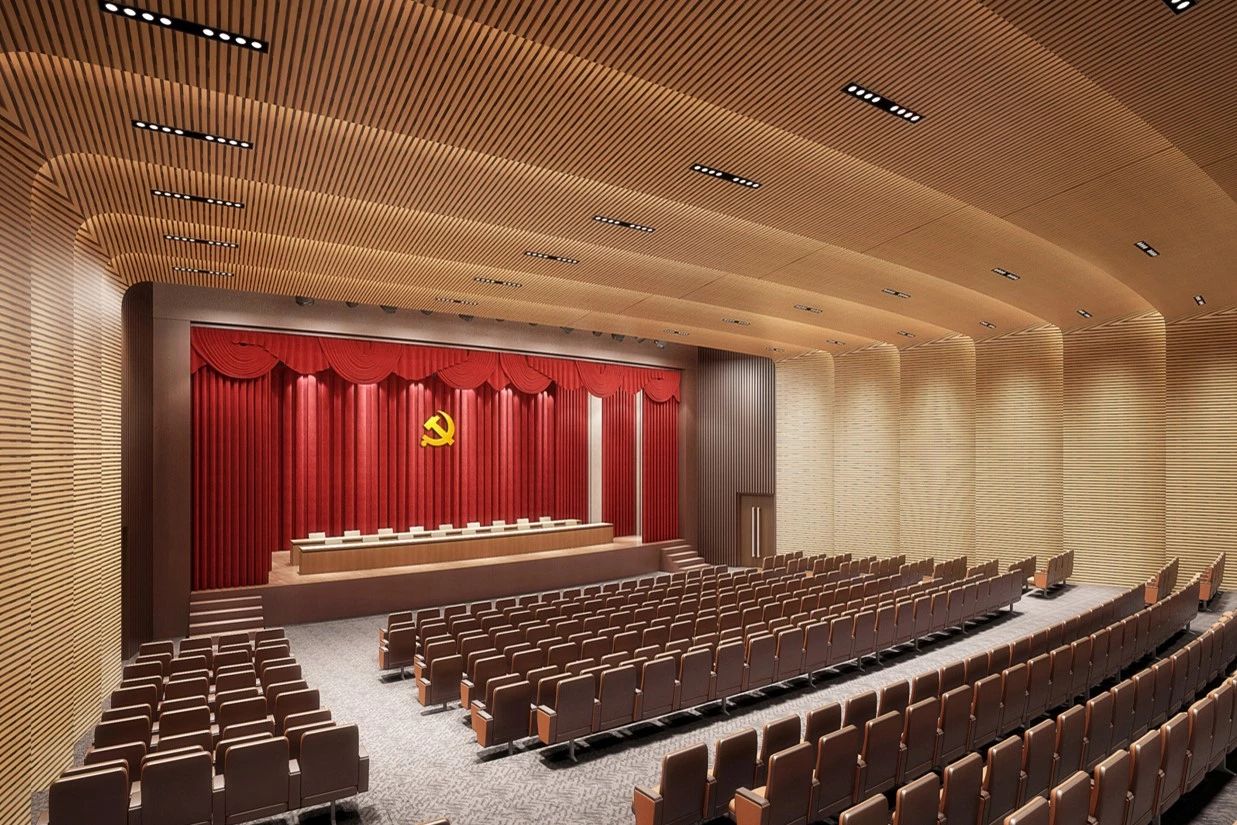 从太阳的能量辐射意象中找到与党和政府象征的贸合,在体育馆的天花设计上,采用木纹铝与穹顶结合,形成一个很有气势的感召空间。