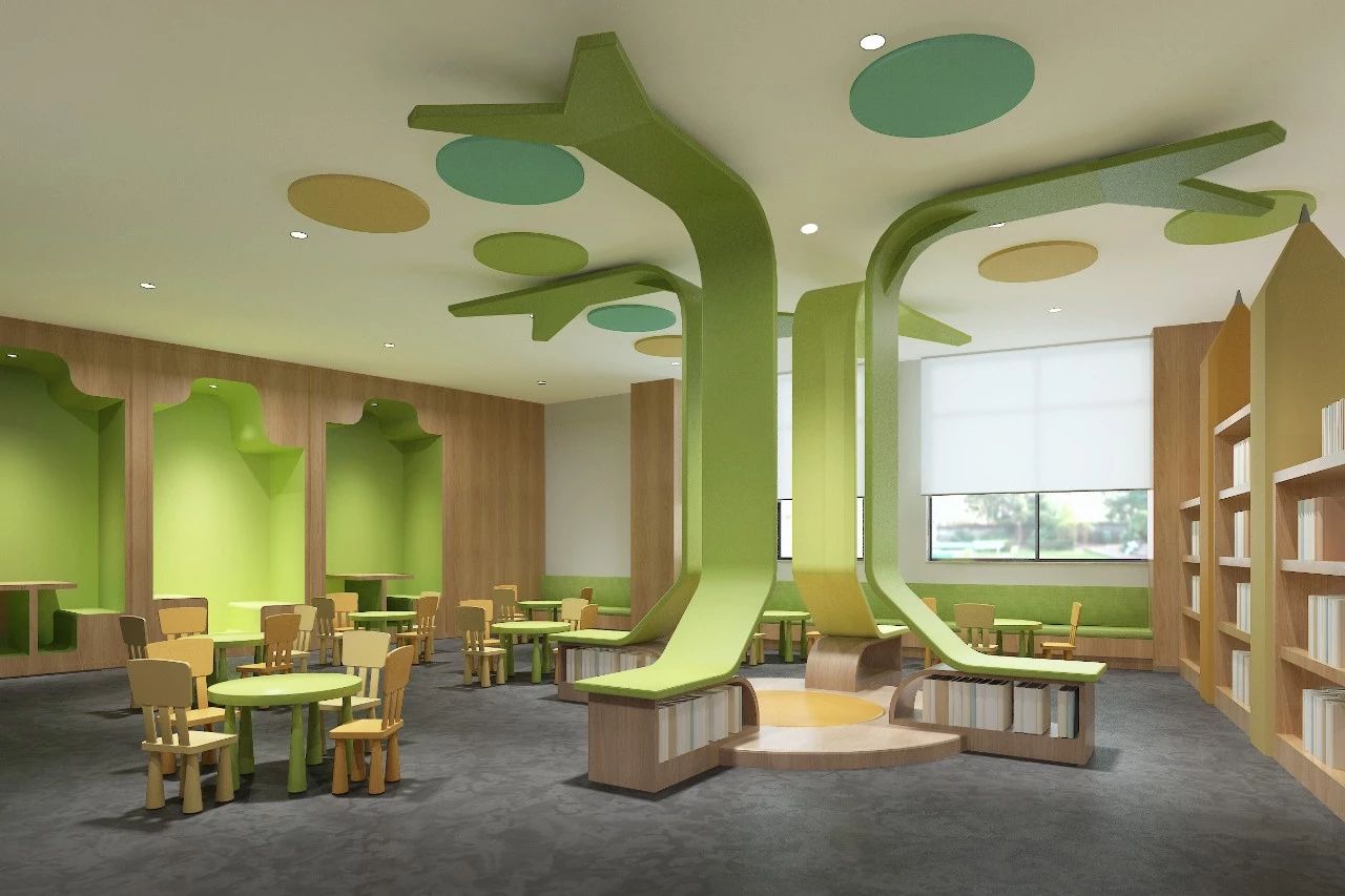 儿童区采用鲜明活泼的颜色对比、轻松愉悦的空间搭配和不失创意的几何构成,整体支撑以抽象的大树和笔杆造型来装饰,相映成趣。