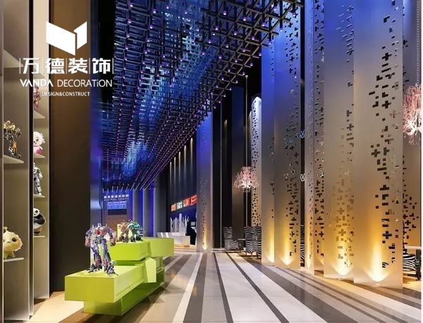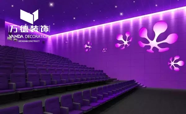 利用直线,三角,圆点的几何元素,流畅的延伸、上下的叠加、交错的贯穿,相互邂逅与碰撞,组合出打破常规的设计,擦出了空间另类的艺术花火,凸显创新的魅力。富有质感的先型现代材料给人强烈的视觉冲击力,光束的多种镭射方式使空间没有丝毫的单调。如电影走廊中天花的圆点与地面的圆点间的贯穿与联系,就像在天地之间的时空穿梭,演绎着电影般的激情与奇幻。这是为年轻人群量身打造的多功能性设计,兼顾声学设计与环境装饰于一体的电影院,如星空般的屋顶,犹如身处幻境,同样是浪漫星空的屋顶,在紫色的主色调中点缀得熠熠生辉。